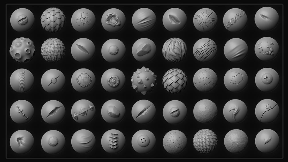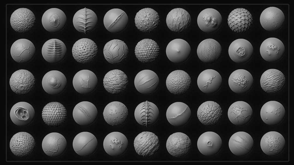 50 brushes to use in Blender, Zbrush or Substance 3D Painter.